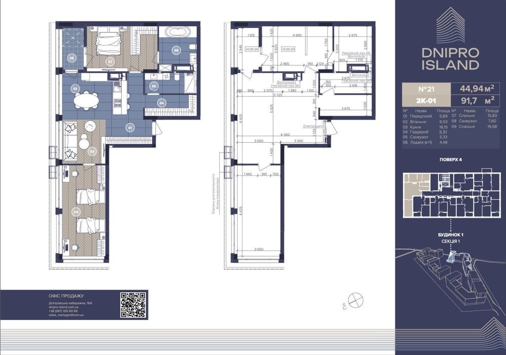 ЖК «Dnipro Island», розташований по вулиці Трускавецькій та Дніпровській набережній. 1 будинок, 1 секція, 2-кімнатна простора квартира, площею 92 квадратних метри. Розташована на 4ому поверсі. Всього 4 квартири на поверсі