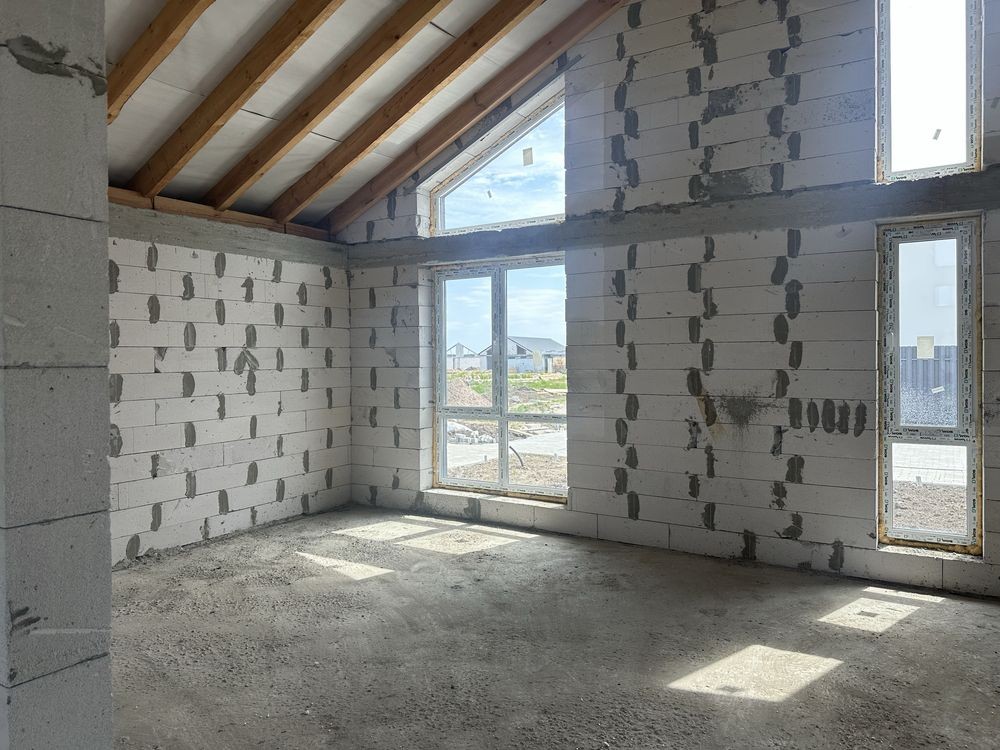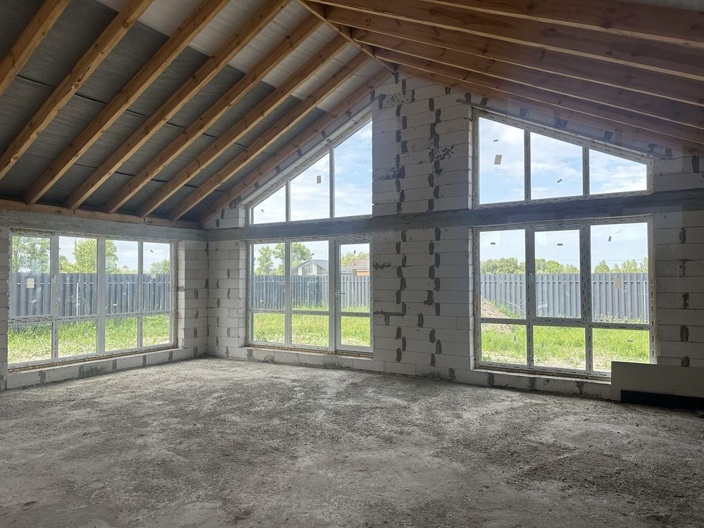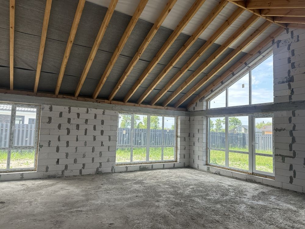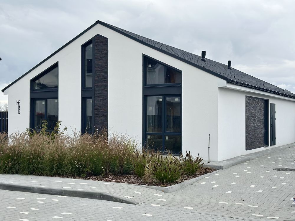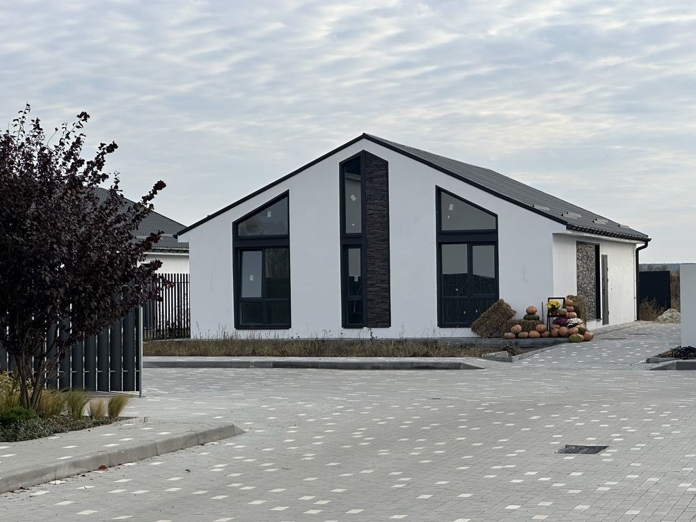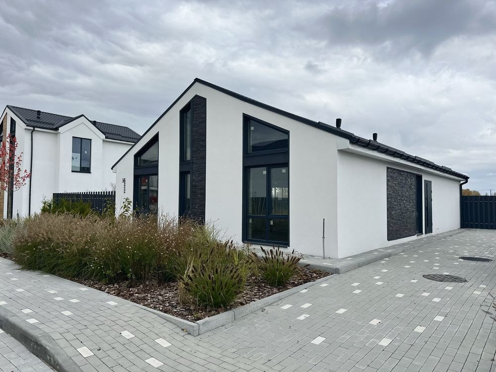 Просторий одноповерховий котедж площею 110 кв.м вміщує три спальні та велику і світлу кухню-вітальню, з панорамними вікнами для максимального природного світла. Стіни з газоблоку та утеплені мінеральною ватою.