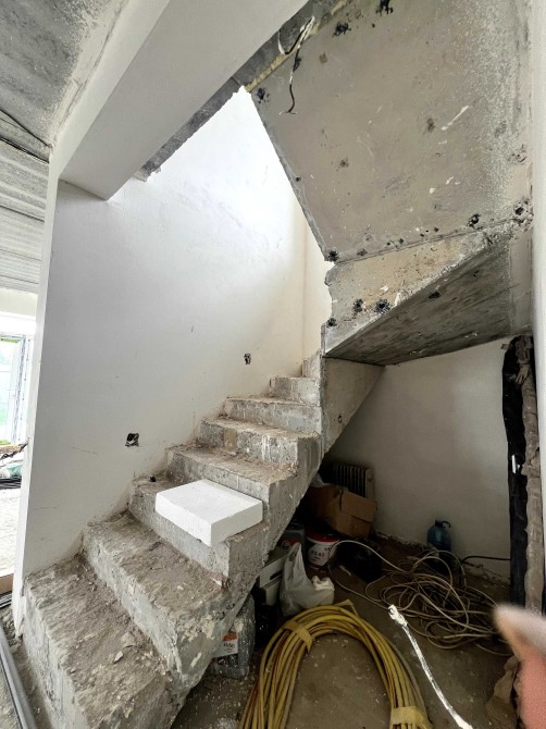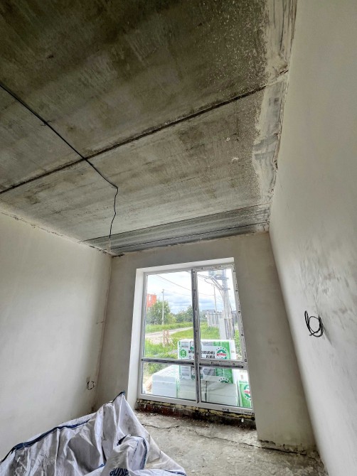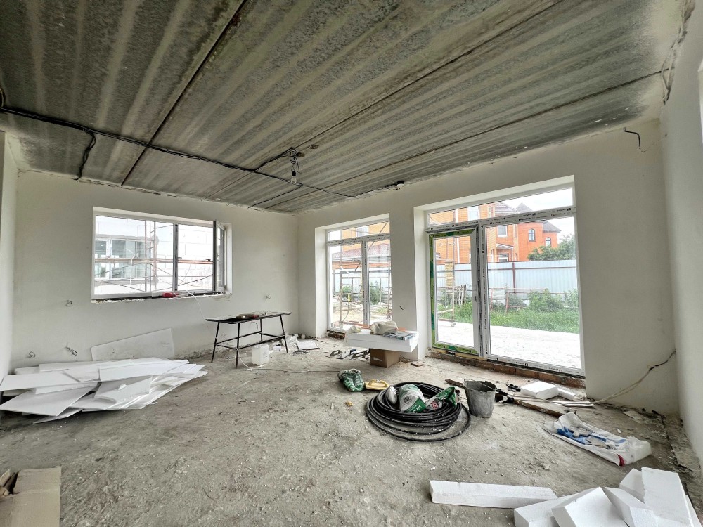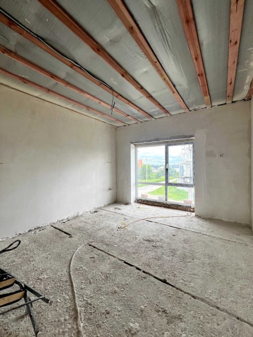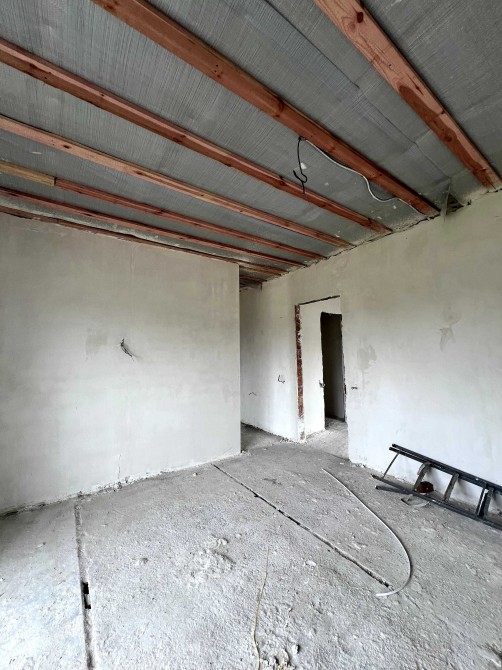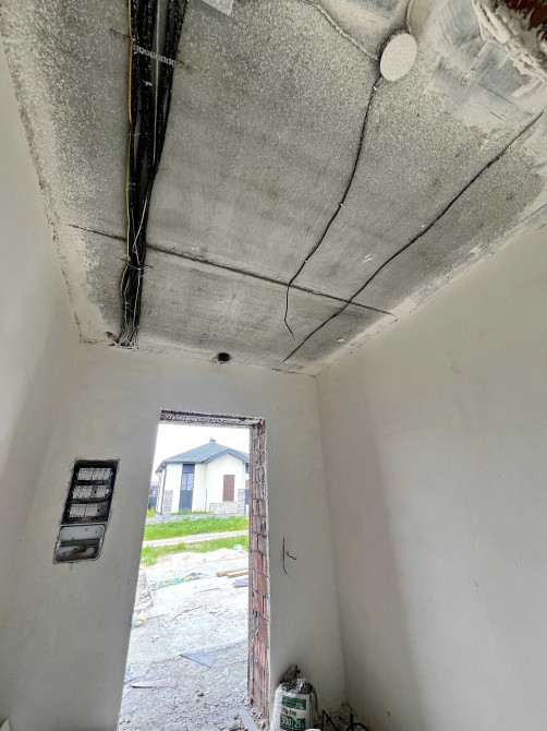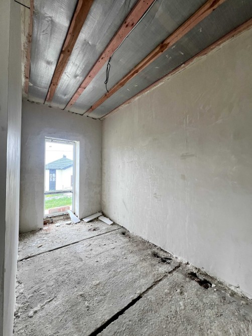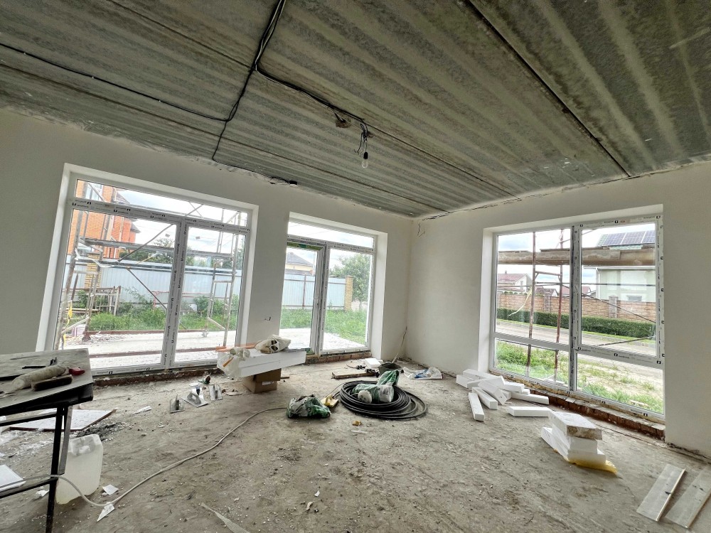 В будинку вже зроблена гипсова штукатурка. Є тепла підлога та чистова стяжка.