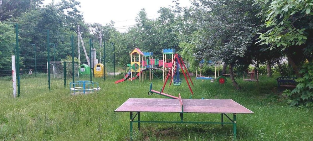 Поряд дитячий майданчик, зона відпочинку на пагорбі біля моря.