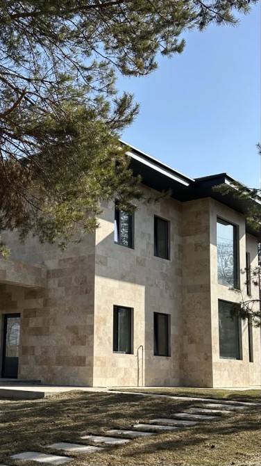 керамоблок, повнотіла цегла, утеплення мінеральною ватою, фасад з натурального травертину.