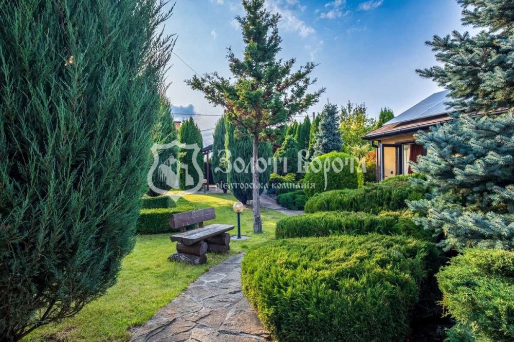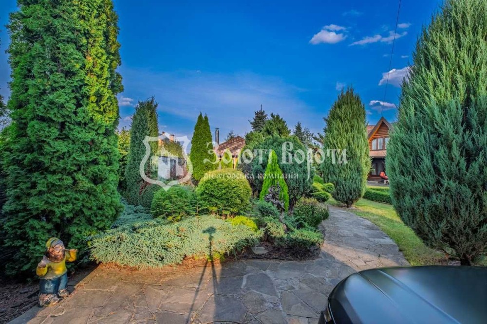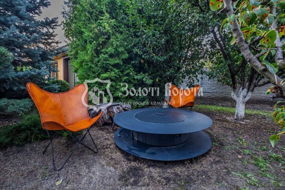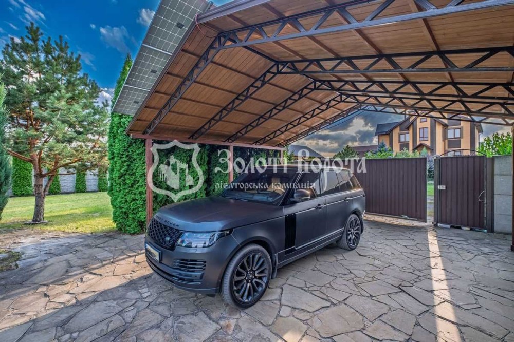 При вході на територію встановлено автоматичний паркан. На подвір'ї — навіс для двох автомобілів, ландшафтний дизайн з декоративними кущами та деревами, фонтан, зона відпочинку з закритою альтанкою та каміном, а також спортивний куточок. Для зручності, встановлено систему автоматичного поливу та сад з фруктовими деревами.