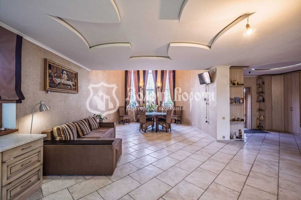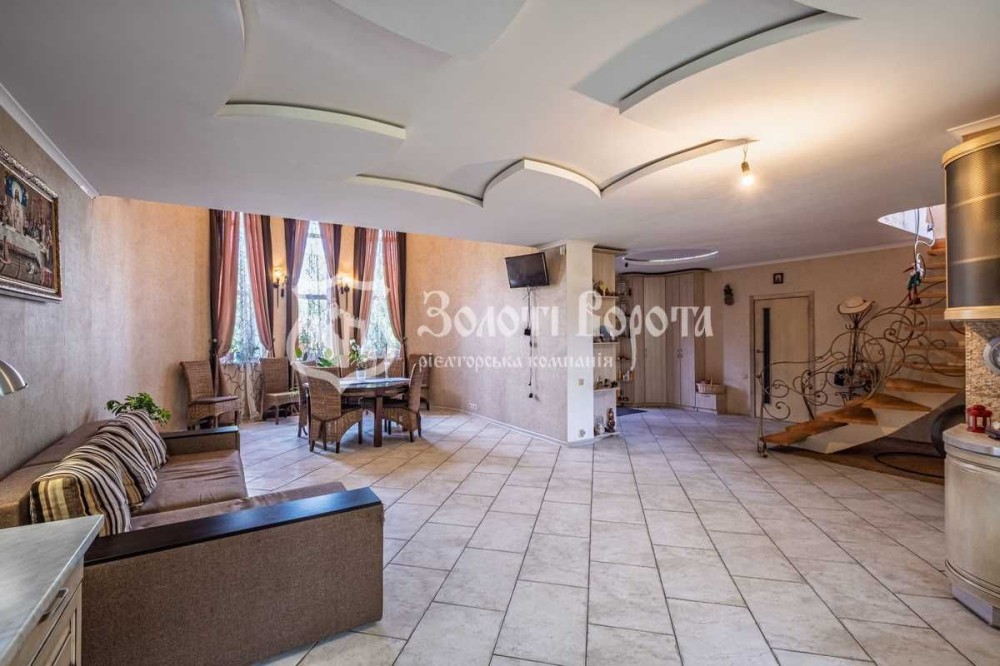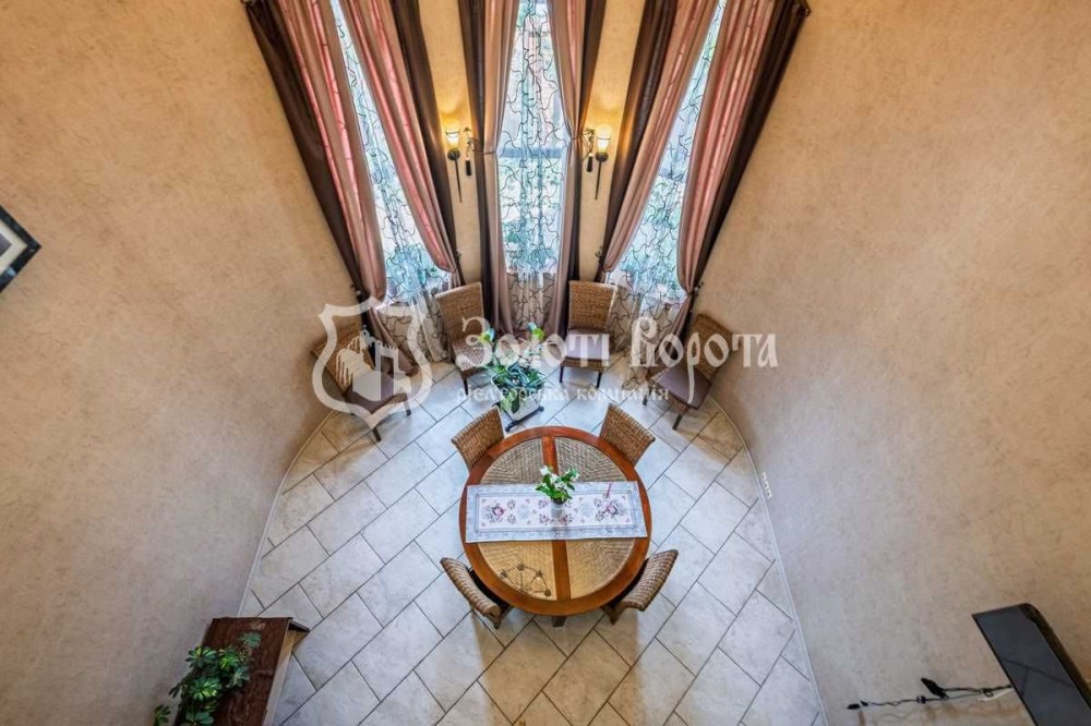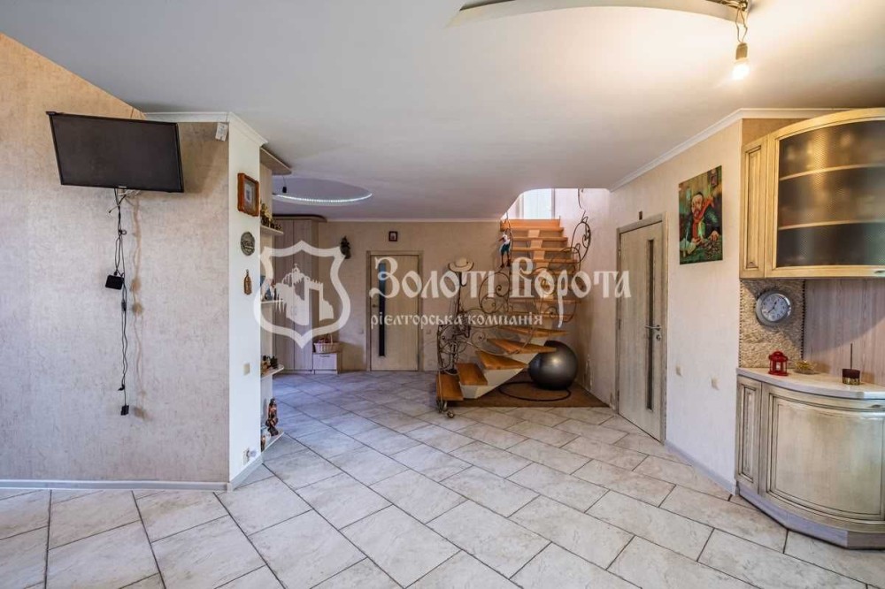 На 1 поверсі розташована простора кухня-вітальня, обладнана вбудованою кухнею з варильною поверхнею, духовою шафою, посудомийною машиною, холодильником та витяжкою. Столова зона включає круглий стіл з 8 стільцями для великої родини, кутовий диван та телевізор.