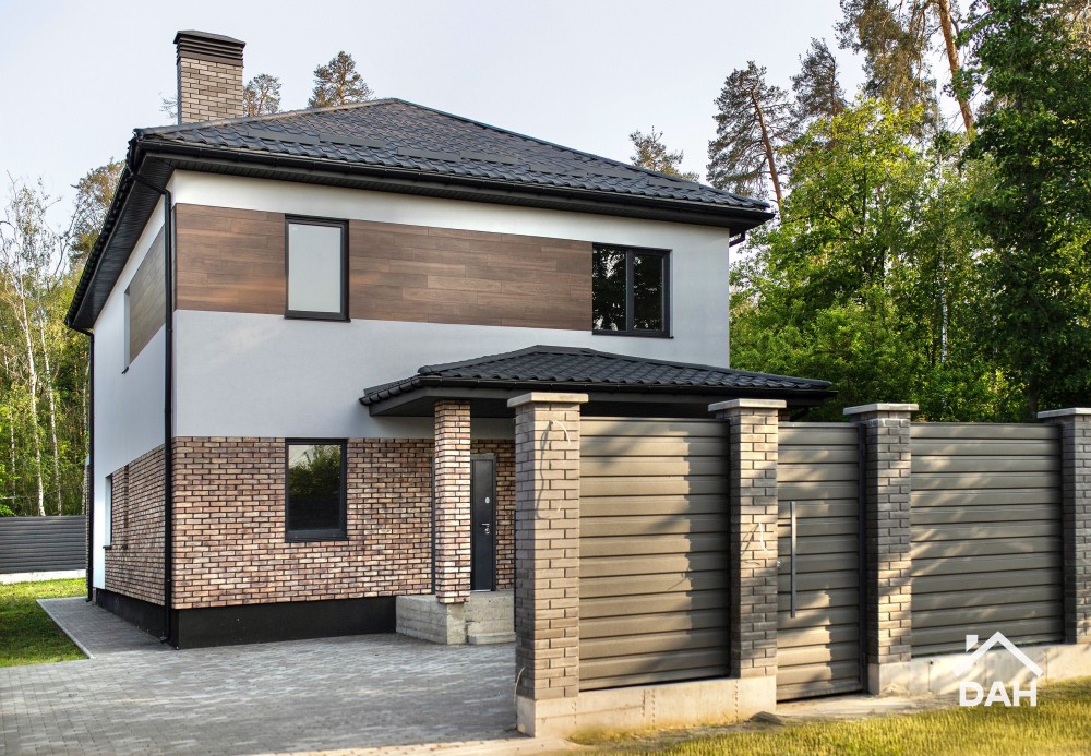 Будинок збудований з червоної цегли 38 см, утеплений мінеральною ватою 10 см, оздоблений клінкерною плиткою та фасадною штукатуркою.