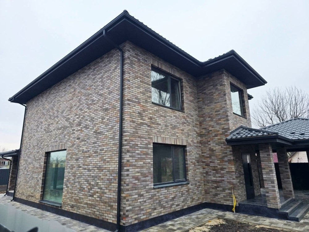 Матеріал стін - цегла+утеплювач та фасад клінкерна цегла, дах металочерепиця.