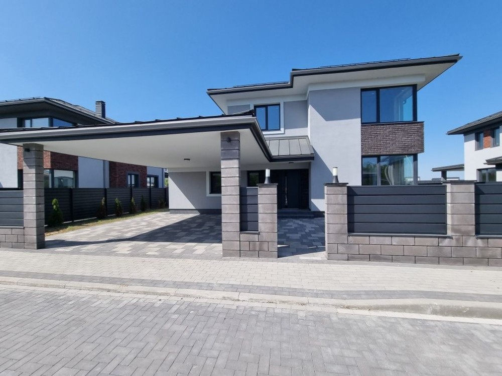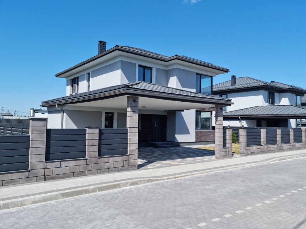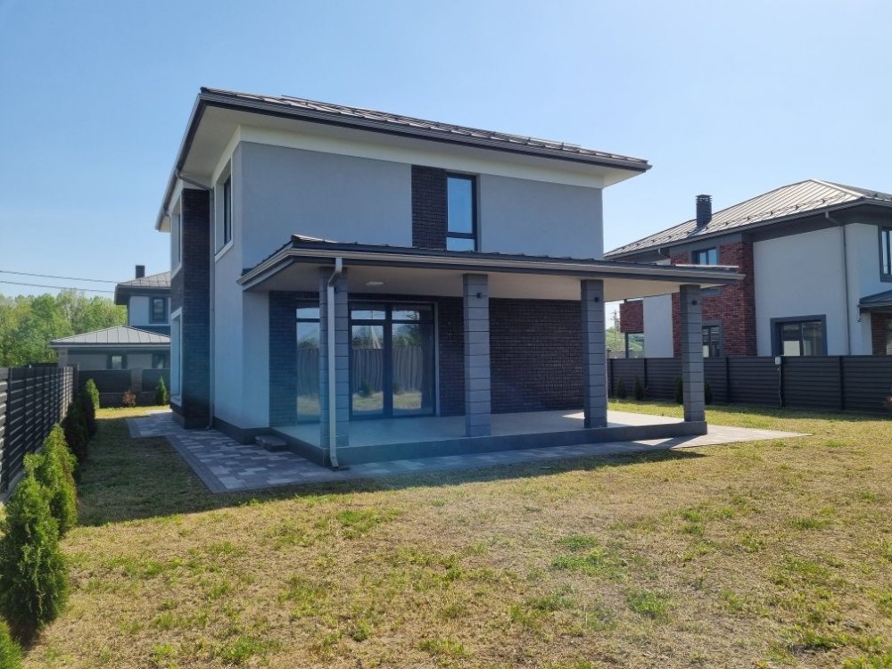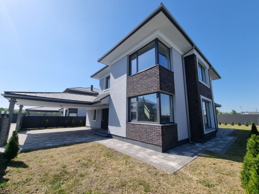 Загальна площа будинку #3 203 кв. м. з терасою + 37 кв.м. навіс для машини під чистове оздоблення. Будинок #3 збудований з червоної цегли, утеплений пінопластом 150 мм. Перекриття - монолітні, дах - Фальцева покрівля, утеплення базальтова вата 200 мм, монолітні ж/б сходи. Стіни оштукатурені машинною штукатуркою під чистове оздоблення. Вікна Саламандер із профілем 70 мм. 1 поверх - хол, простора кухня, вітальня з виходом на терасу, спальня, сан.вузол, котельня, кімната для інвентарю (госп.блок). 2 поверх - 3 спальні, гардеробна, 2 сан.вузол.