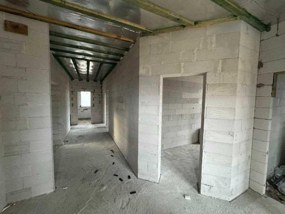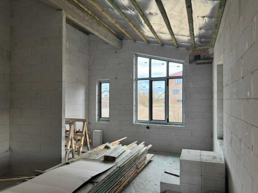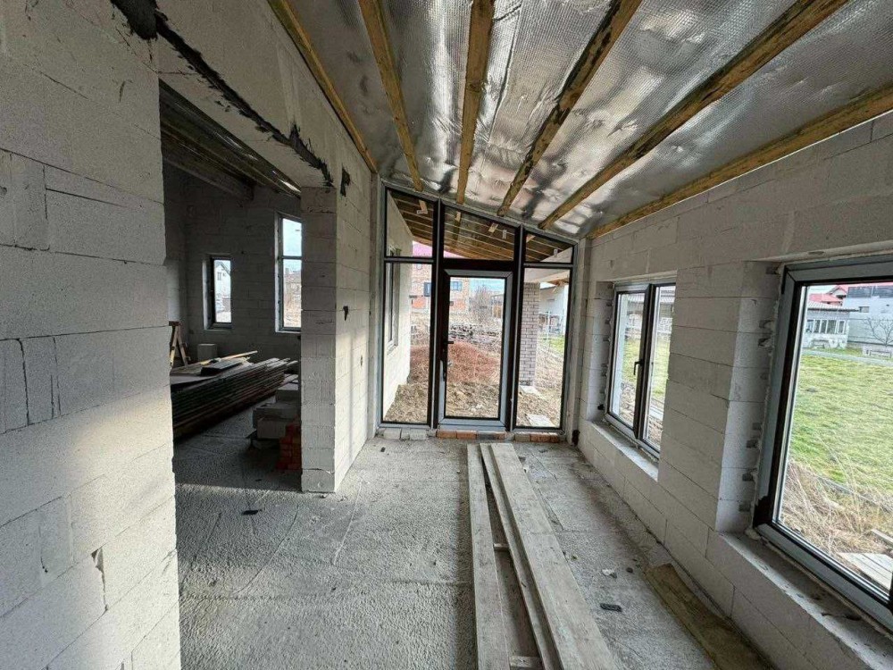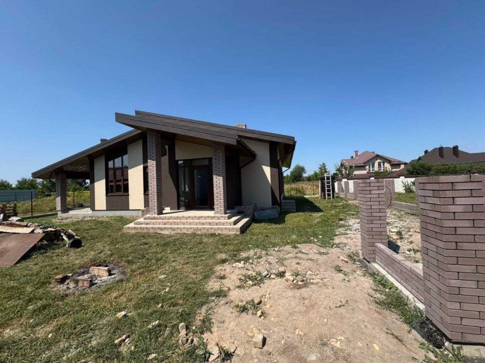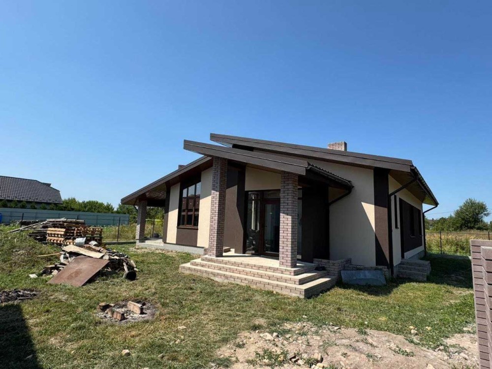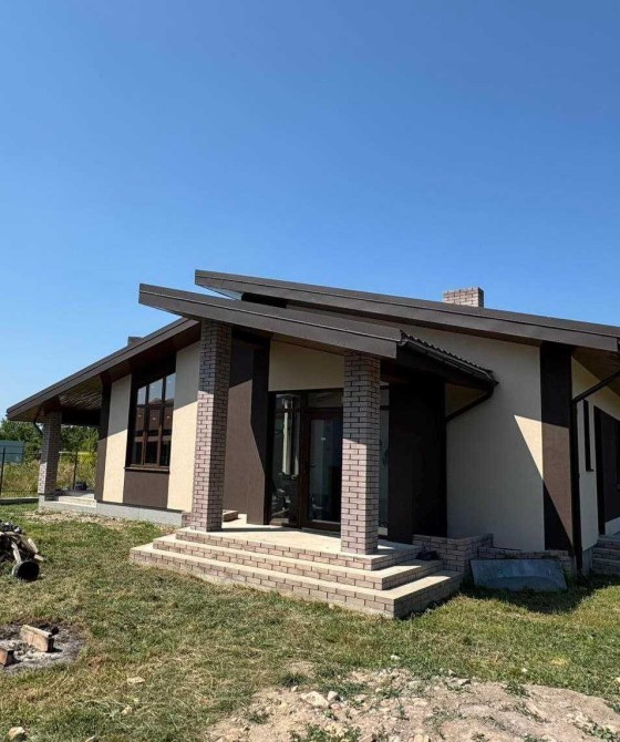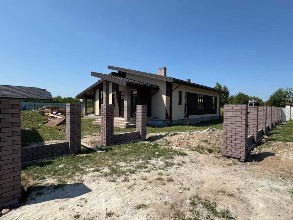 Будинок одноповерховий з сучасним , раціональним плануванням, енергозберігаючий. Великий зал з кухнею та виходом на закриту терасу із каміном, три спальні з гардеробами, два санвузла і тех. приміщення, тераса. Дах: німецька металочерепиця, утеплений мін-ватою ROCKWOOL (200мм). Вікна великі (колір- темний дуб): профіль Rehau-70 (Німеччина) 5-камерний, фурнітура GU (Німеччина), склопакет 2-кам. енергозберігаючий, надійні вхідні двері. Підключено світло (20кВт), заведена вода (своя свердловина - глибина 15м), зроблений септик, можливість підключити газ. Переваги власного будинку: один поверх, приватна територія (6,5 сот.), пар- ковка для авто, свіже і чисте повітря , зручна локація . Поруч проживають сусіди, територія частково обгороджена парканом, вулиця освітлена. Будинок зданий в експлуатацію. Ціна приблизно - 1115$ за кв.м..