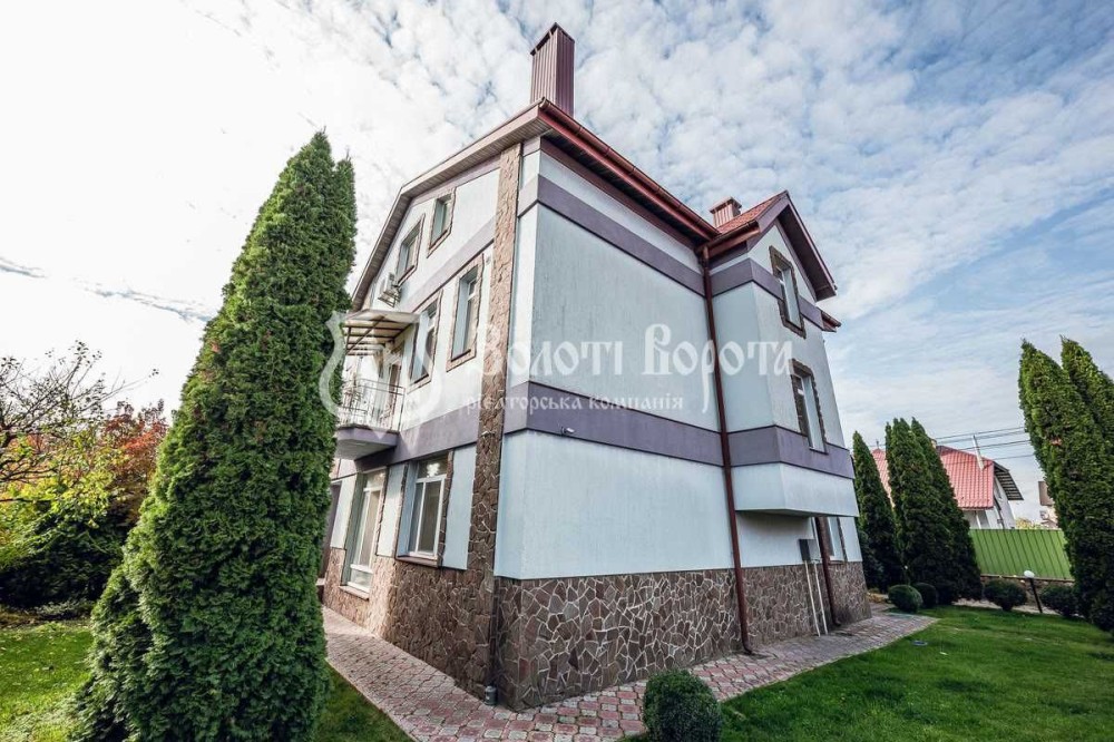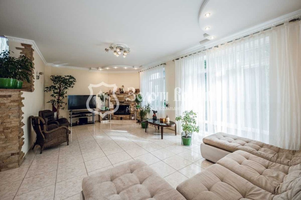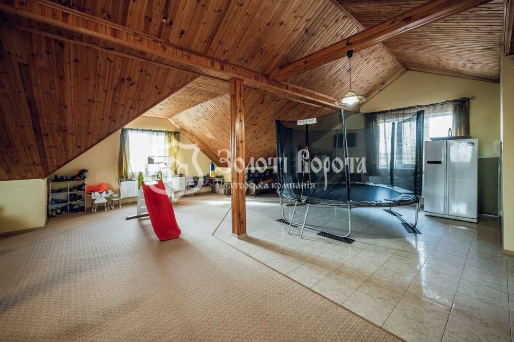 У будинку — 5 кімнат, 3 гардеробні, 4 санвузли, погріб, баня/сауна, велика кухня-вітальня, джакузі, камін, більярд, система очищення води, кондиціонер, охоронна та пожежна сигналізація, відеонагляд.