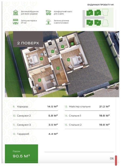 2 поверх - 3 спальні, гардеробна, 2 сан.вузла, горище.
