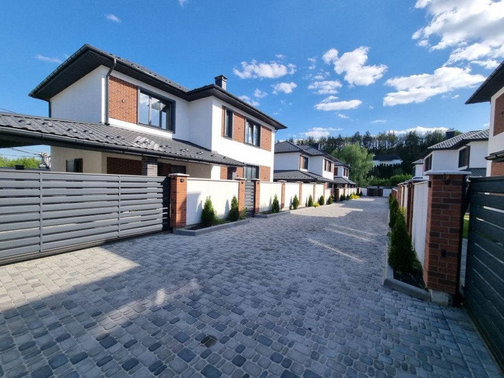 У котеджному містечку є ворота в'їзд за пультом. Дорога тротуарна плитка, вздовж дороги освітлення, озеленення.