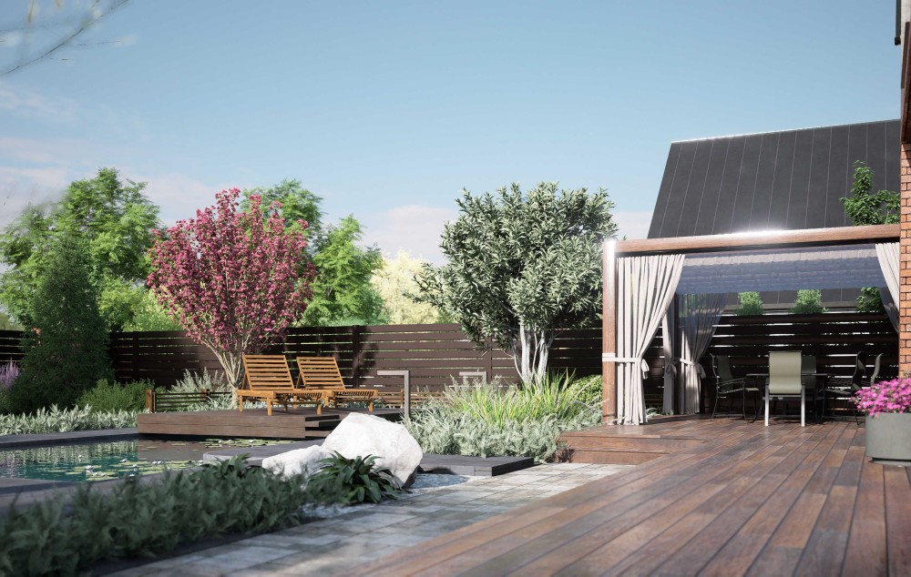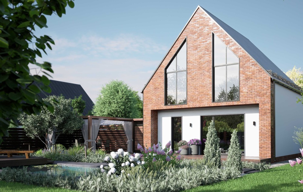 з центрального входу в будинок виконується благоустрій згідно ескізного проєкту будинку та оснащення системою поливу