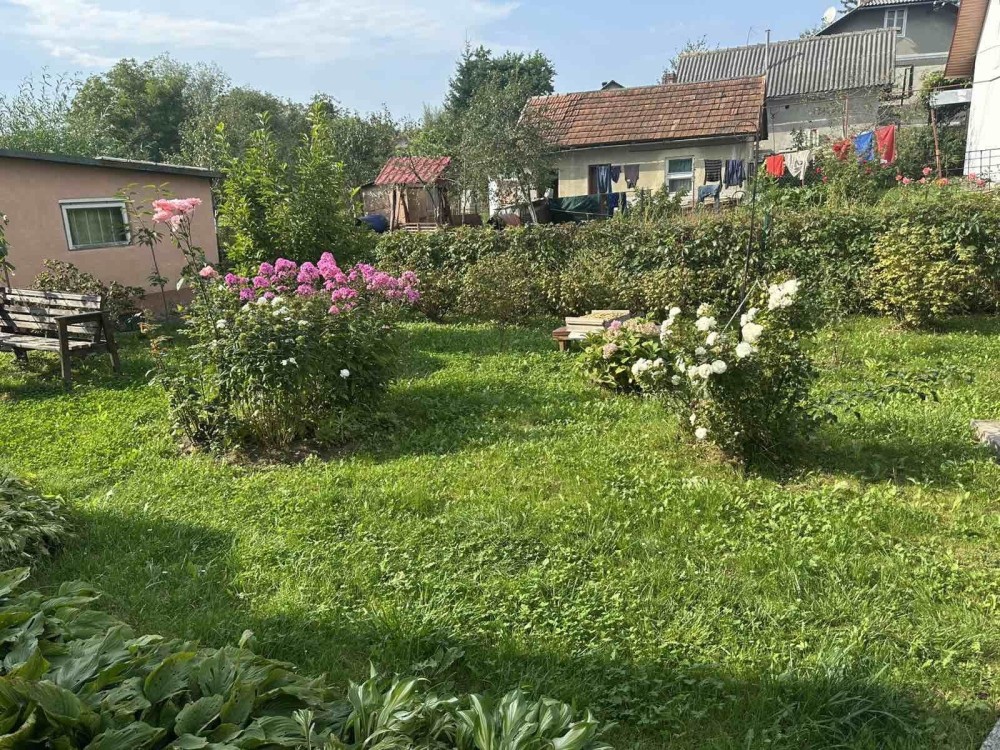 Земельна ділянка площею 7 соток, добре доглянута та повністю огороджена, з молодим садом.