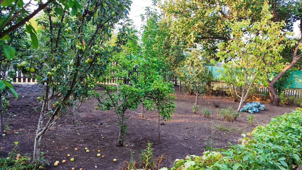 На території подвір'я є різноманітні дерева: груші, черешні, яблуні, персик, абрикоси, сливи, також є виноград, малина.