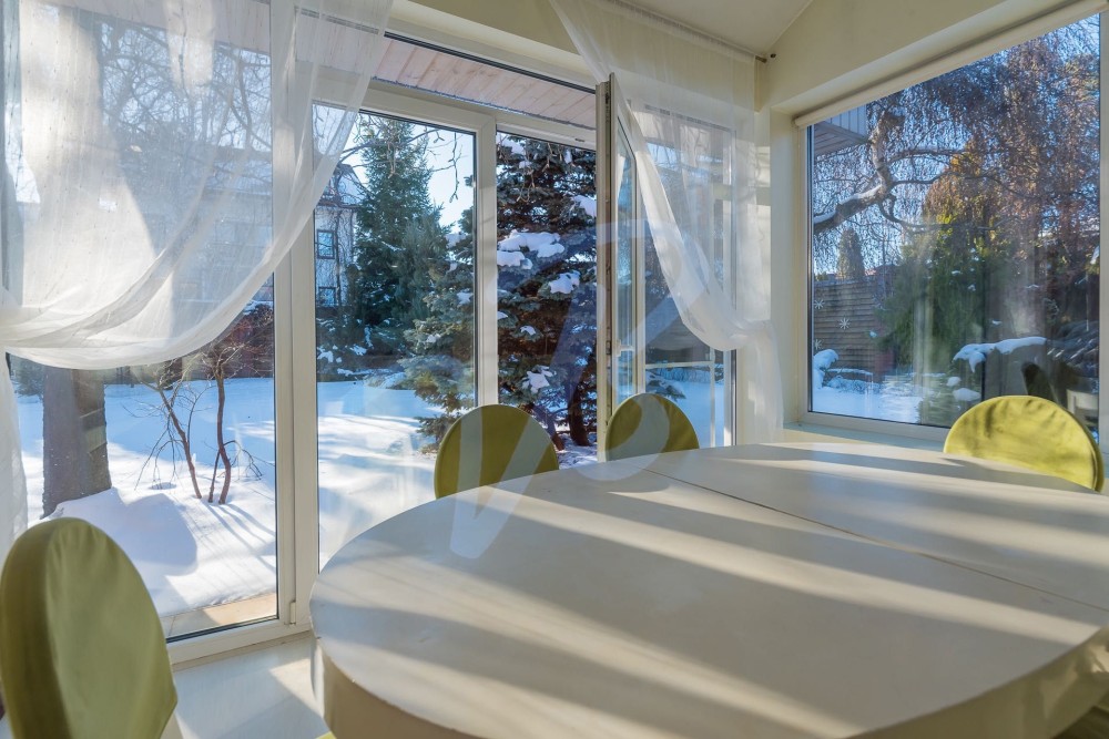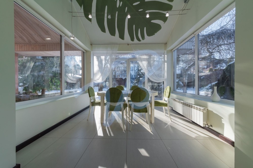 Простора вітальня з панорамними вікнами та обідньою зоною з видом на сад.