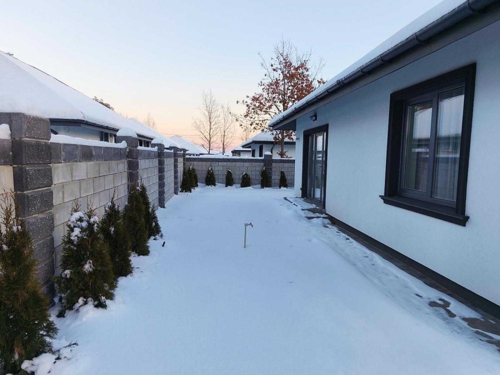 В будинку є кухня-вітальня (30м.кв.) з виходом на терасу, 3 спальні, гардеробна, санвузол, прихожа і горище.