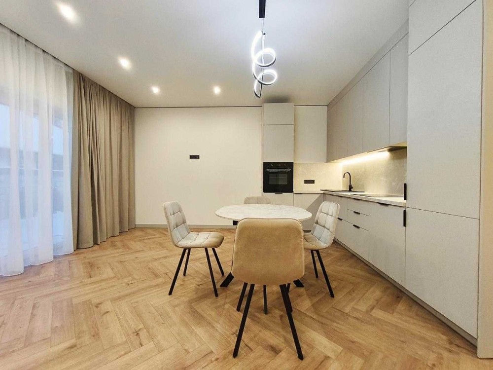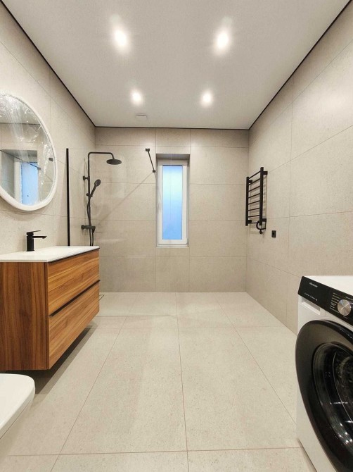 Всередині зроблений гарний і якісний ремонт в світлих тонах. Встановлена кухня з вбудованою технікою - ПММ, холодильник, варильна поверхня, духова шафа, витяжка. Також в кухні-студії є великий розкладний диван. Санвузли укомплектовані меблями і сантехнікою. Встановлені дизайнерські LED-світильники. По всьому будинку змонтована система теплої підлоги. Також ще є бойлер, пральна машинка, кондиціонери, електричний котел. Є можливість підключити газ.