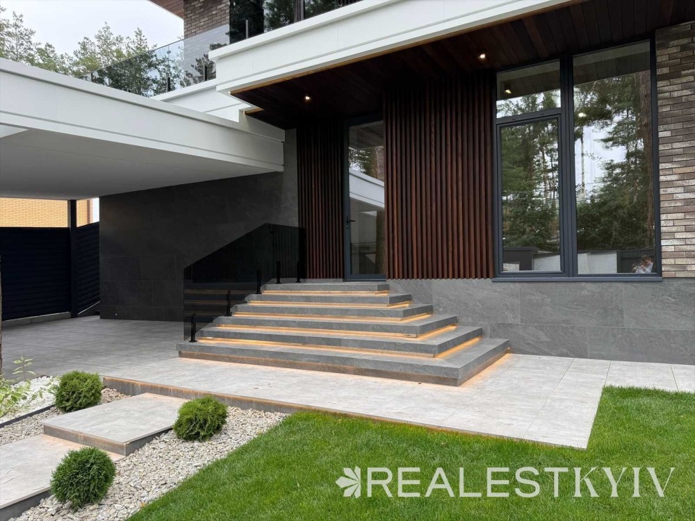 Вулична підсвітка фасаду, сходів, басейну та території.