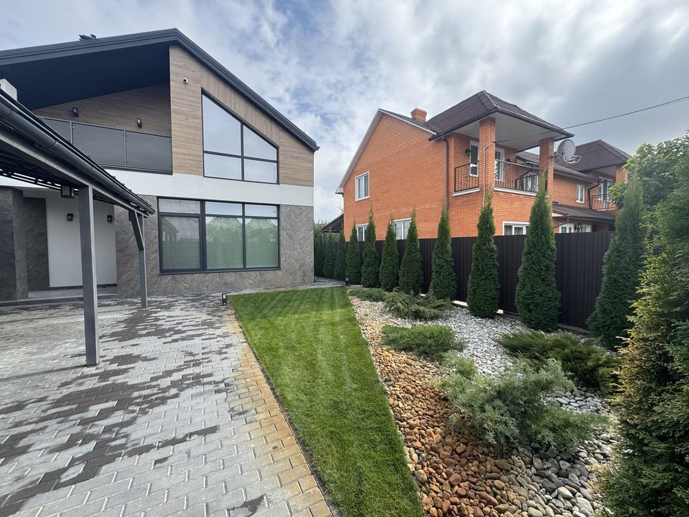 Новий будинок з ремонтом, розташований в с. Глеваха, що оточене лісом та має озеро з пляжем.
