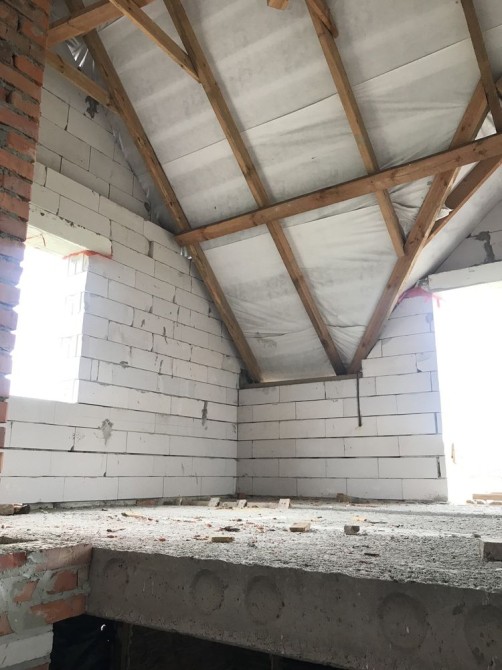 Перший поверх збудований з цегли, другий - з блоків (Aeрок D40O), перегородки - цегла.