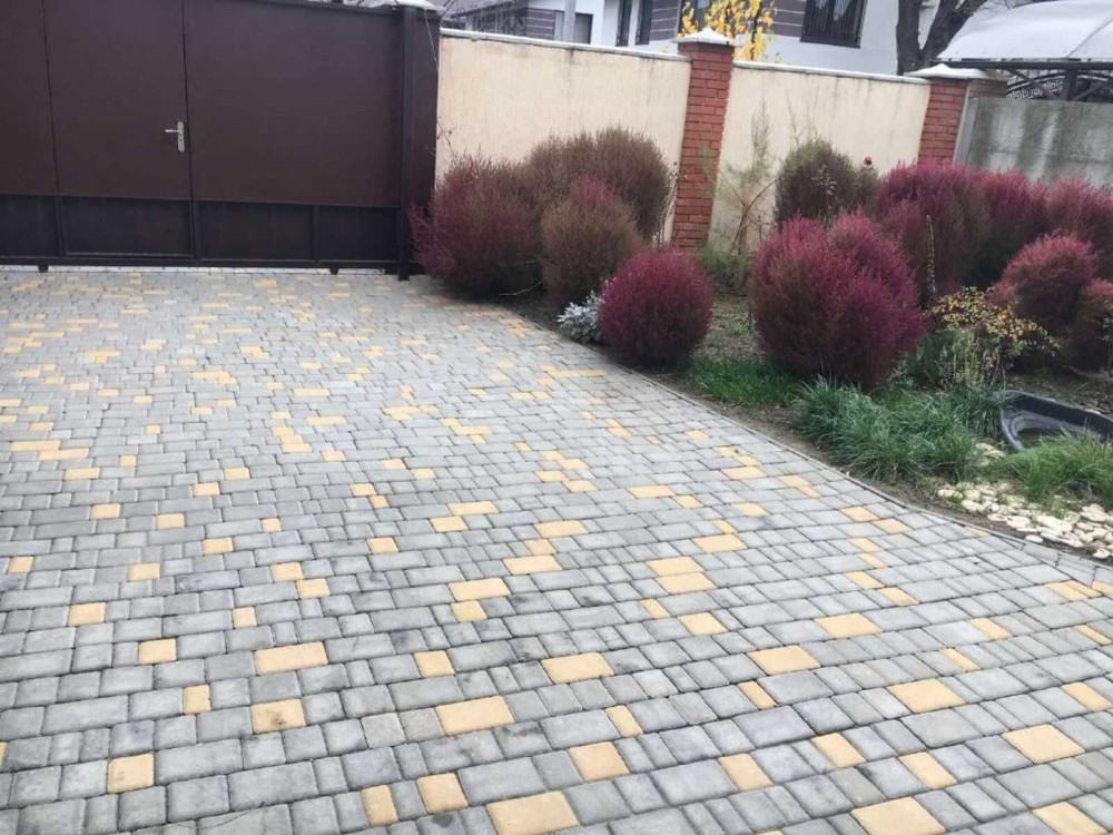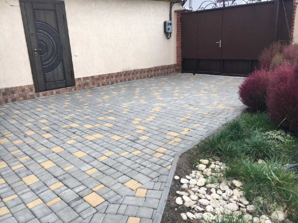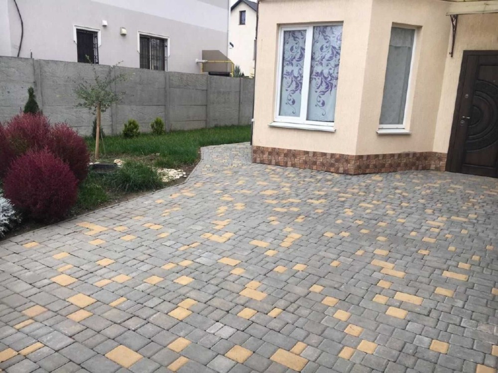 У гаражі ролетні ворота, двір вимощений плиткою, є гостьове місце для паркування.