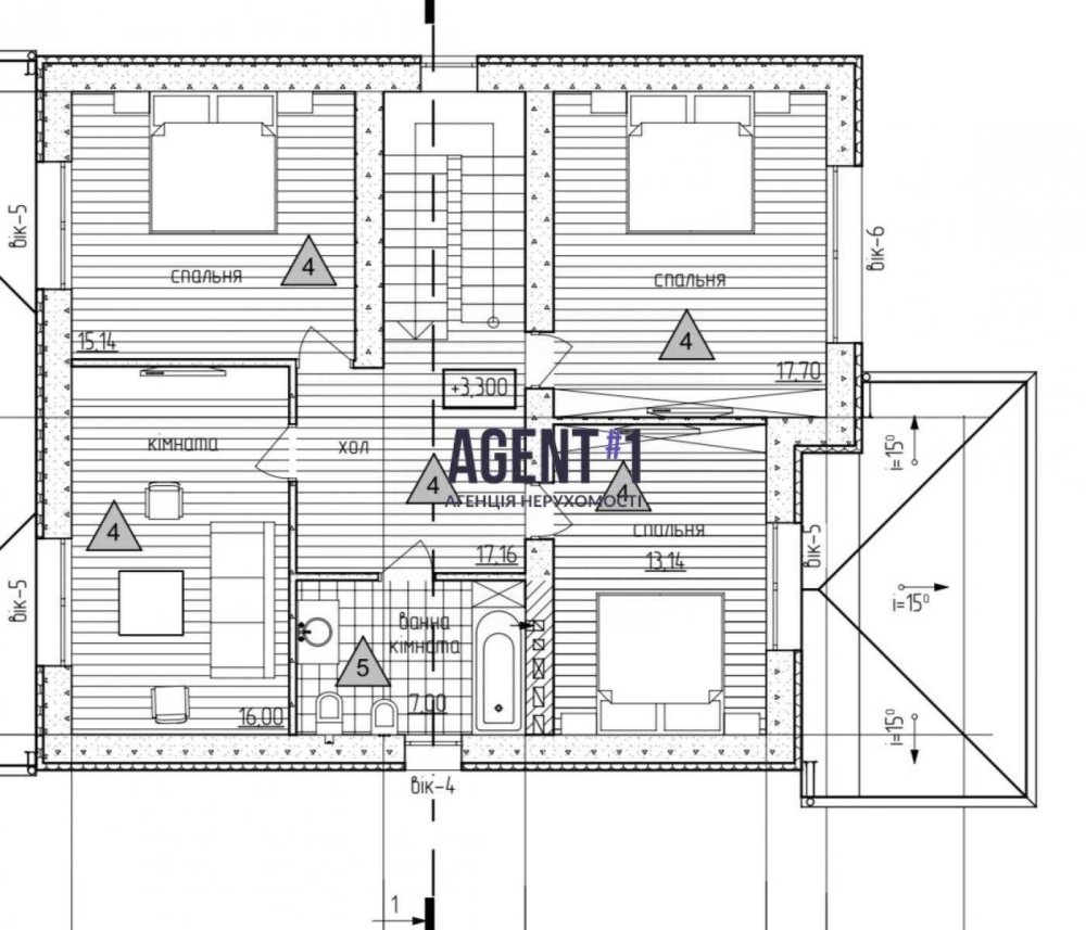 На другому поверсі велика хазяйська спальня з гардеробом і санвузлом, 2 спальні, санвузол загальний і кабинет або гардероб.