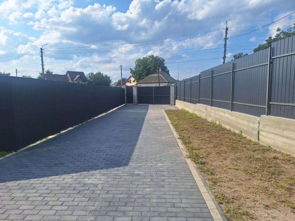 По теріторії: спланована ділянка, паркан по периметру, фасадний паркан з воротами, залита відмостка та майданчик для 3х авто, тротуарна плитка.