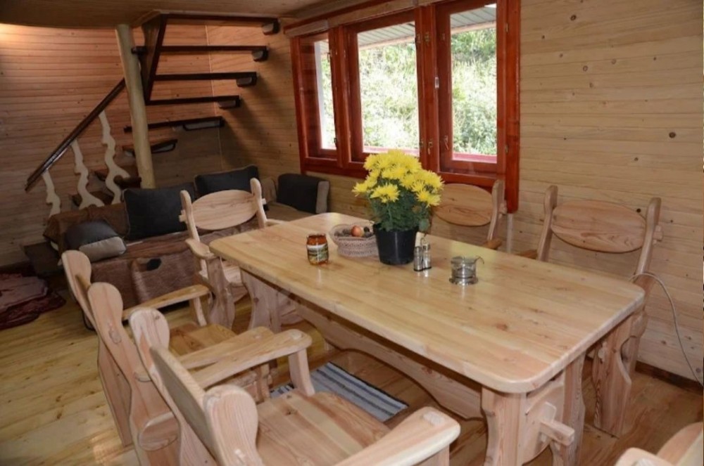 Ціна від 10000 грн. До 7 гостей -10000 грн за добу. Лазня та басейн оплачується окремо 5000 грн за добу або погодинно -1000 грн за годину.(Мінімум 4 години). Доплата за кожного наступного гостя 1000 грн. П’ятниця ,субота та неділя вартість оренди на 1000 грн вище. 332 Будинок-зруб з басейном з підігрівом та лазнею. 3 великі спальні, розрахований лише до 12 гостей, за стіл можна розмістити до 12 гостей та спальних місць 9. Приймаються тільки не гучні компанії. На території є альтанка з зоною барбекю, мангал, тенісний стіл. На першому поверсі: зал-студія, басейн з підігрівом та лазня. На другому поверсі 3 роздільні, просторі спальні. Лазня, басейн та квадроцикл оплачується окремо. Також можлива оренда без лазні та басейну. Будинок повністю обладнаний для комфортного проживання, є всі необхідні меблі та побутова техніка, є стіл на 8 персон та камін.
