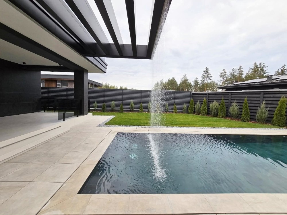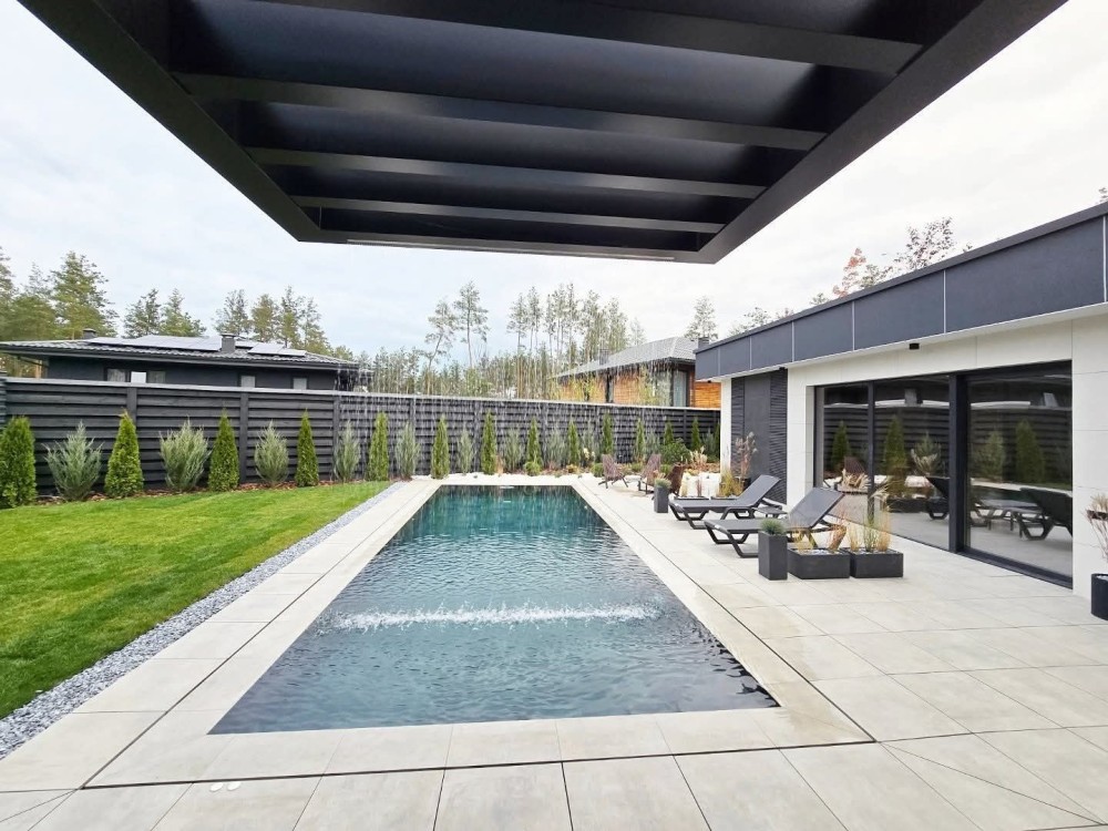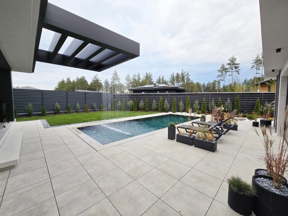 Басейн переливного типу (9,5 × 3,5 м). Зона барбекю для відпочинку. Патіо-кострище зона. Можливість підключення газу. Стіни з цегли 38 см. Утеплення 15 см. Фасад облицювальна плитка, панелі.
