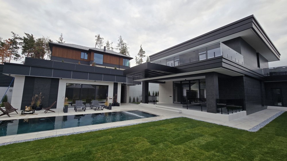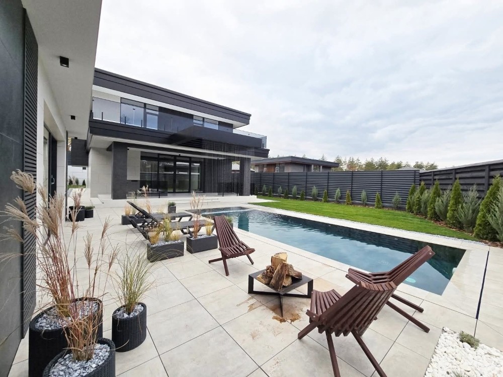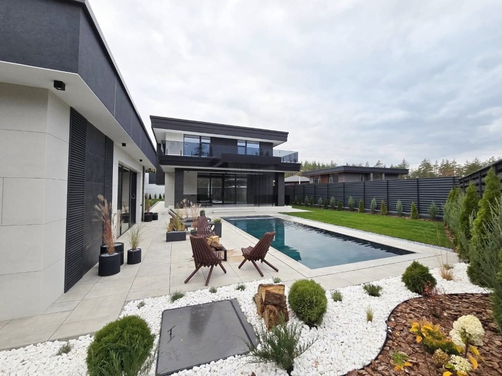 Сучасний будинок преміум класу 230 м², додатково навіс на 4 авто, 2 тераси балкон, басейн з фонтаном; гостьовий будинок чи сауна 50 м2 , ділянка 9 соток землі. Гарна панорама, біля сосен.