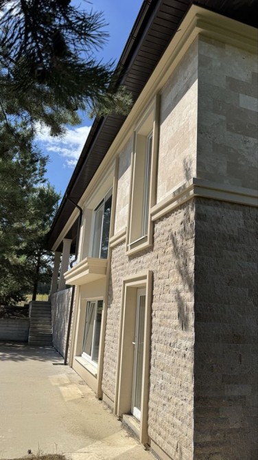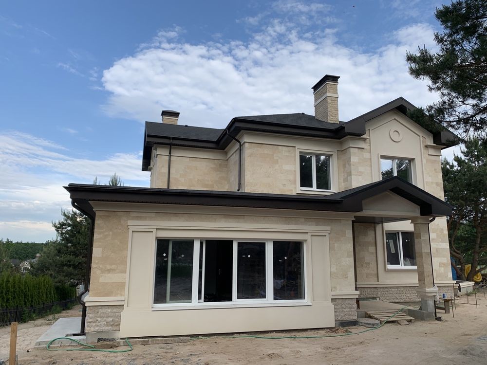 Стіни 380мм (цегла), утеплення 100мм. Обкладений натуральним камінням - травертін.