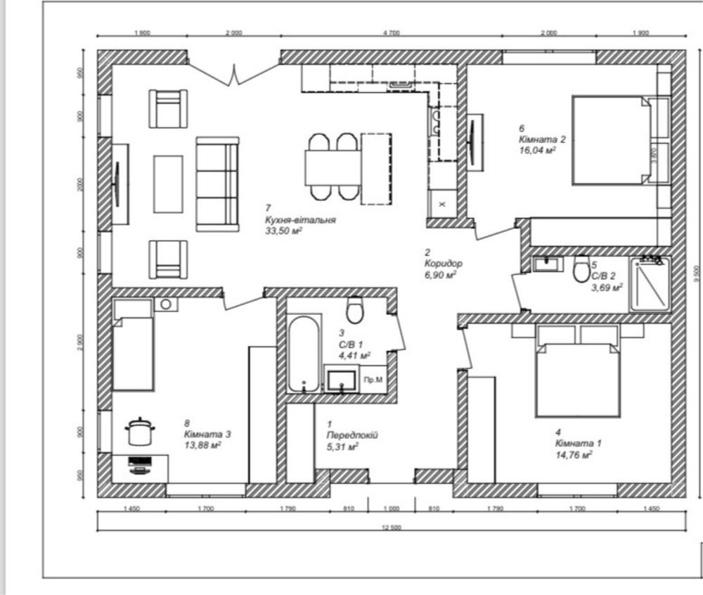 3 роздільні спальні, велика кухня-вітальня, санвузол 1 або 2 на ваш вибір.