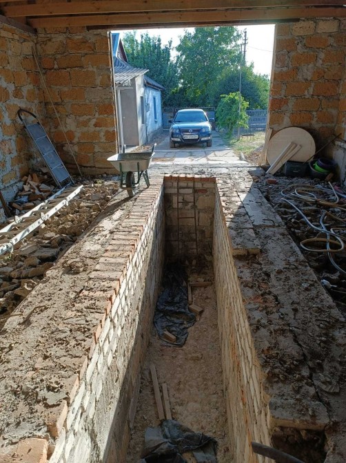 Новий гараж з оглядовою ямою, літньою кухнею над підвалом з бетонних блоків, металевий дах.