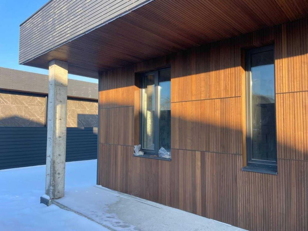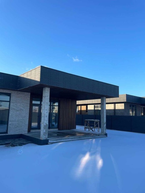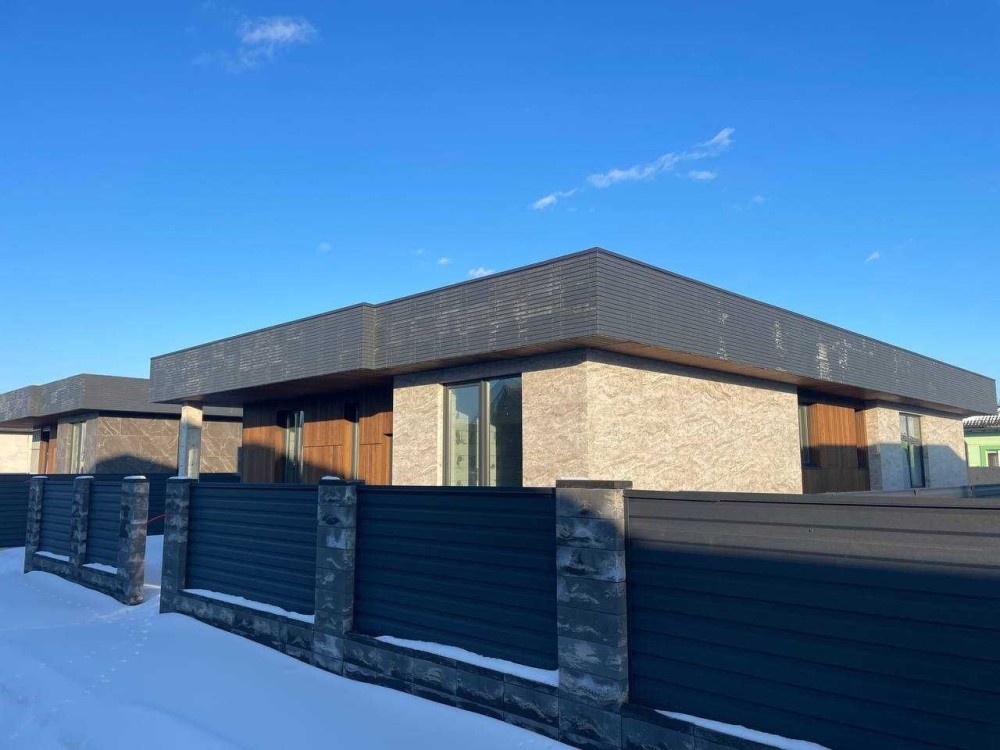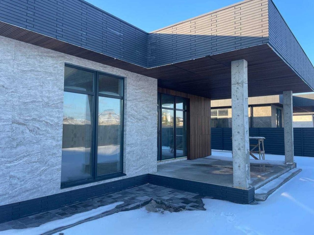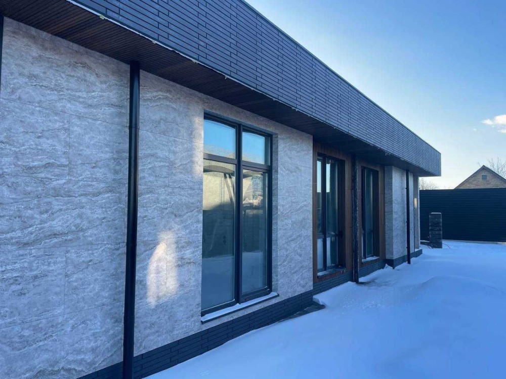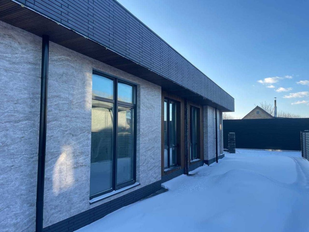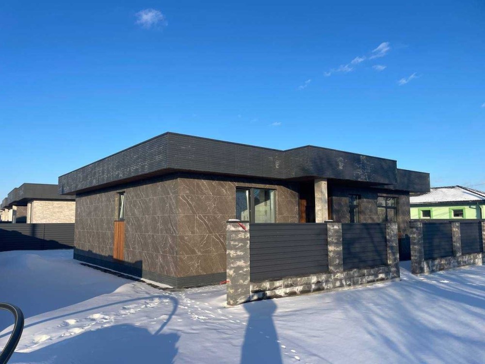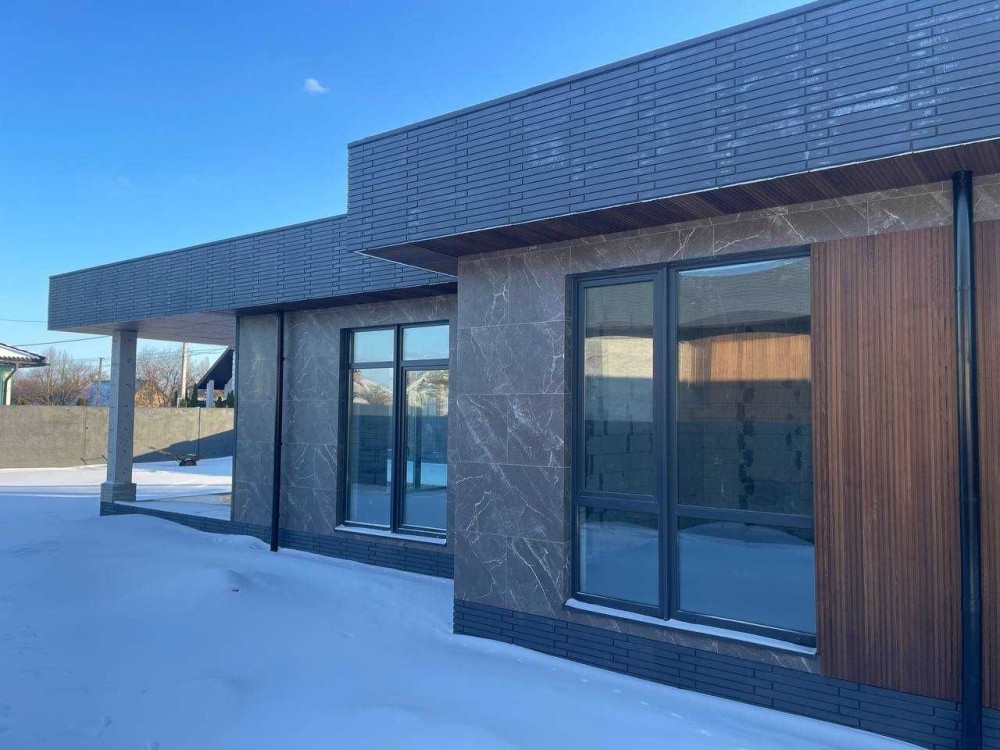 Дуже стильні будинки в архітектурі хай-тек, які виглядають значно дорожче своєї ціни. Сучасний фасад з декоративними планками та керамогранітом під камінь робить будинок реально ефектним — це той варіант, який одразу привертає увагу.