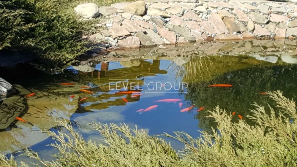 Окрасою ділянки є великий ставок з бетонною основою з водними рослинами і декоративними рибами,