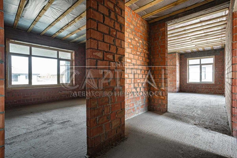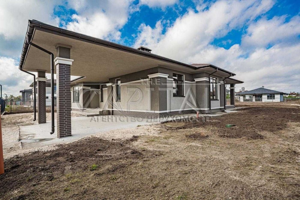 У будинку є три просторі спальні. Два санвузли, гардеробна, кухня, зона їдальні і вітальні з можливістю установки каміну. Також простора крита тераса, бойлерна і навіс для двох автомобілів.