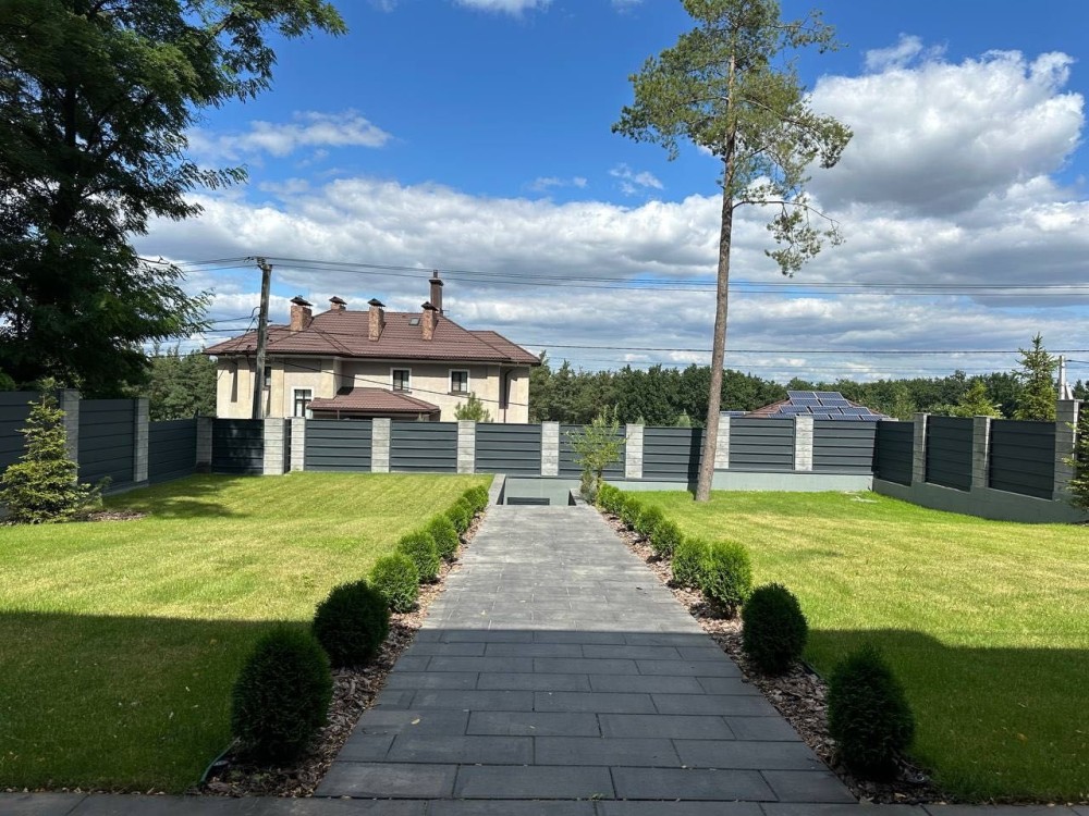 Декоративні насадження, Автополив, Рулонний газон, Територія вимощена тротуарною плиткою, Паркан по периметру, Гараж для 2 авто.