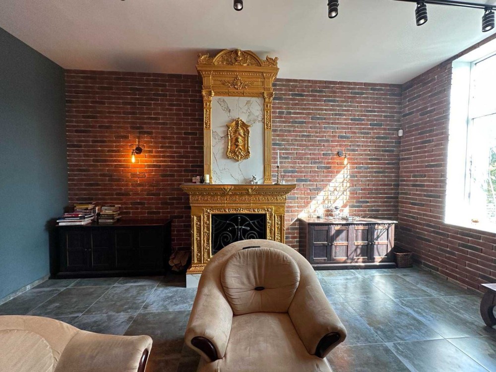 З декору: керамогранітна плитка, комбінація декоративної штукатурки та фарбованих стін, в зоні каміну викладено плитку під цеглу…
