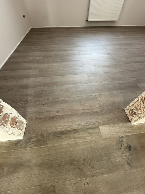 - На 1-му та 2-му поверсі: покладено керамограніт по усій підлозі, в спальнях ламінат.