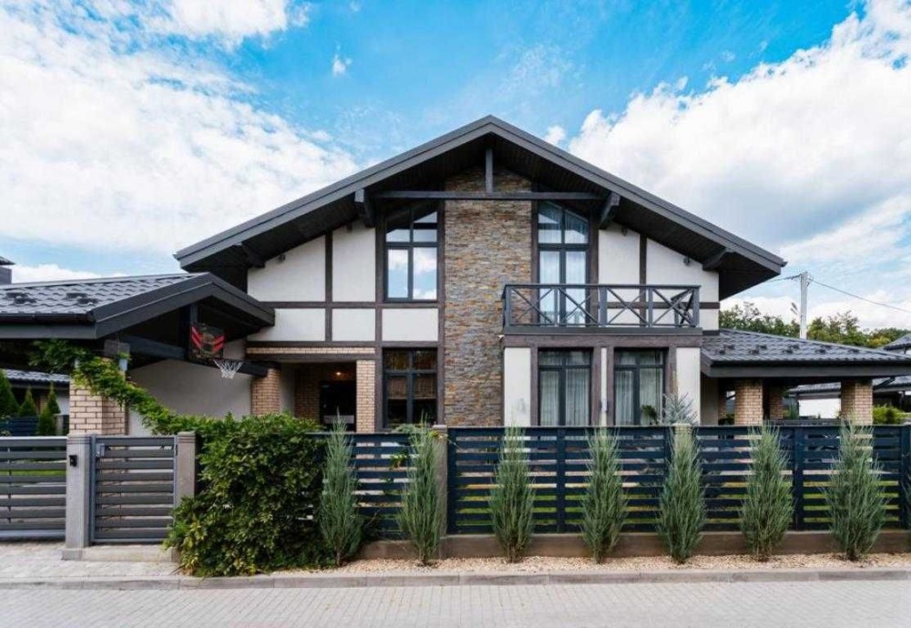 • Сучасний стиль американського / англійського шале (теплі тони, натуральні матеріали, панорамні вікна)