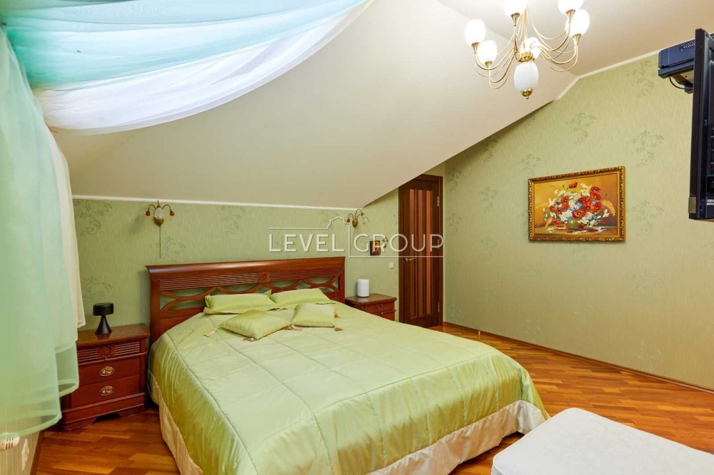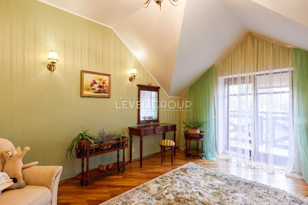 2-й поверх: 2 спальні. 1ша кімната з виходом на балкон та гардеробною, 2га також з виходом на балкон, та власним санвузлом. Загальний санвузол. Сходи на велике горище.