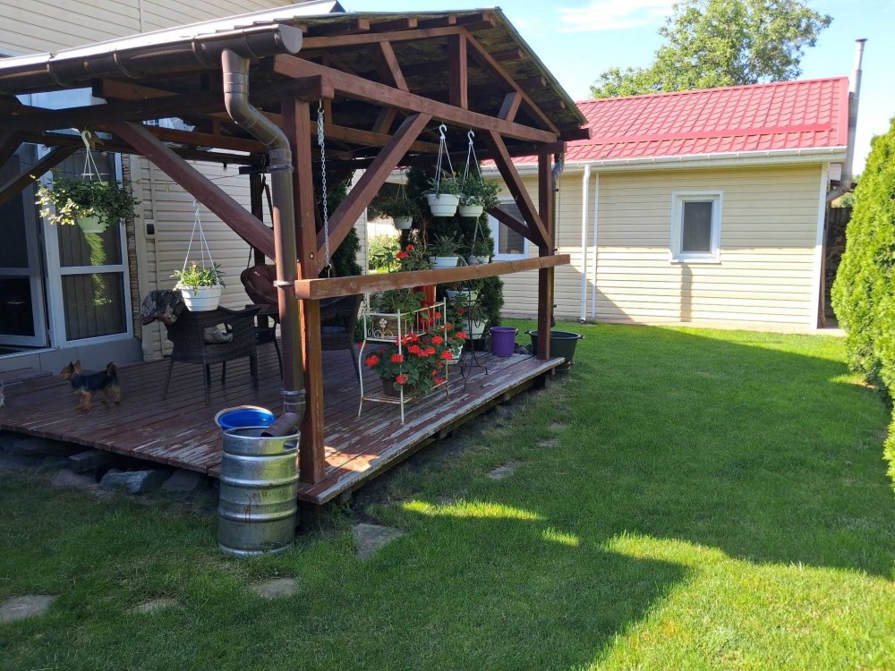 З веранди вихід на задній двір де розташована бесідка та зона барбекю, оточені газоном і туями.
