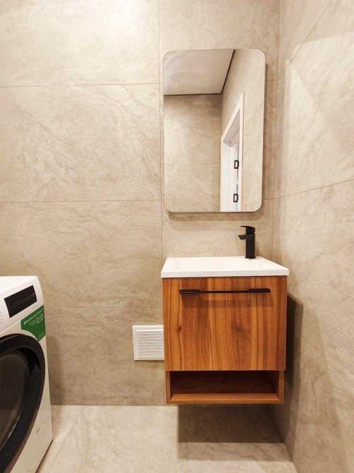 * кухня та ванна кімната з меблями та технікою.