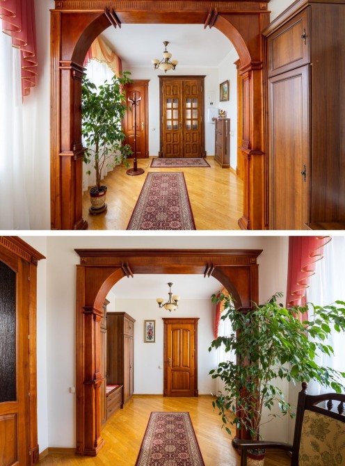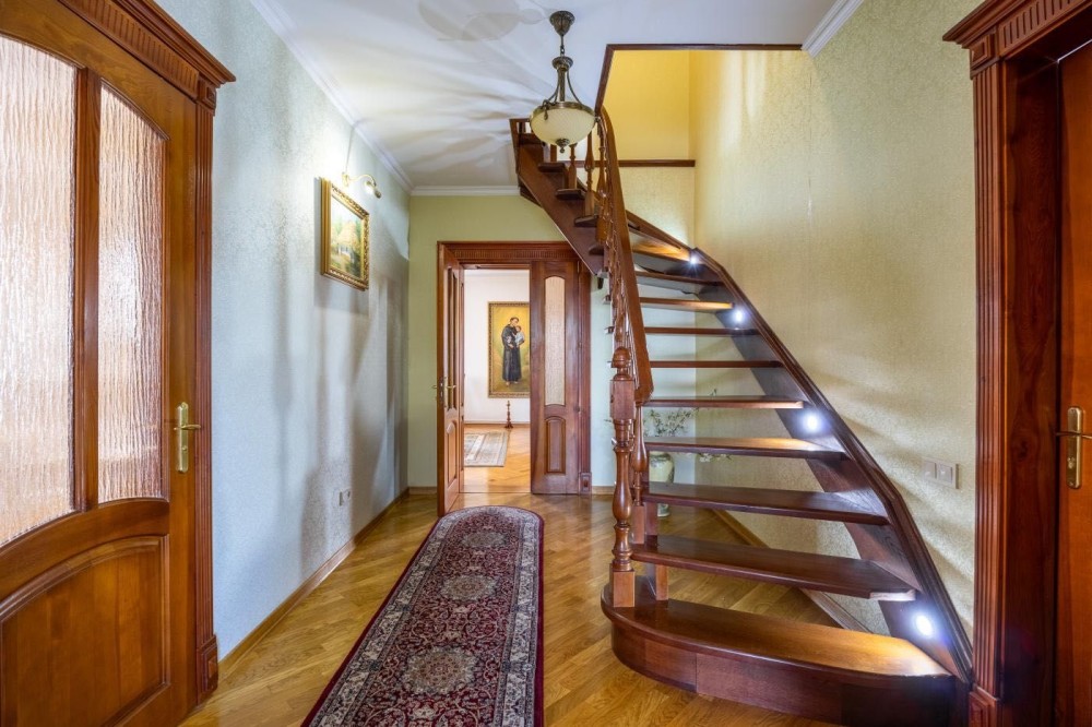 Вхідні двері, сходи та підлога — з натурального дуба.