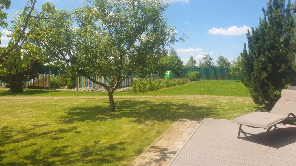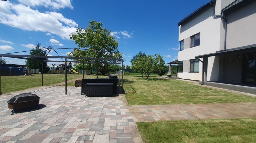 На ділянці зоновані: дитячий майданчик, зона барбекю, гарний сад, озерце з фонтанчиком та ліліями, огородик, плодові дерева, теплиця, технічне приміщення для садового інвентаря, автонавіс для 2 авто.