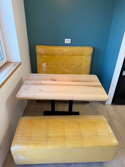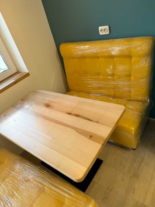 - Кухонний стіл в стилі "кафешок" велика столешня з дерева і диванчики по боках, з окремою теплою підсвіткою.