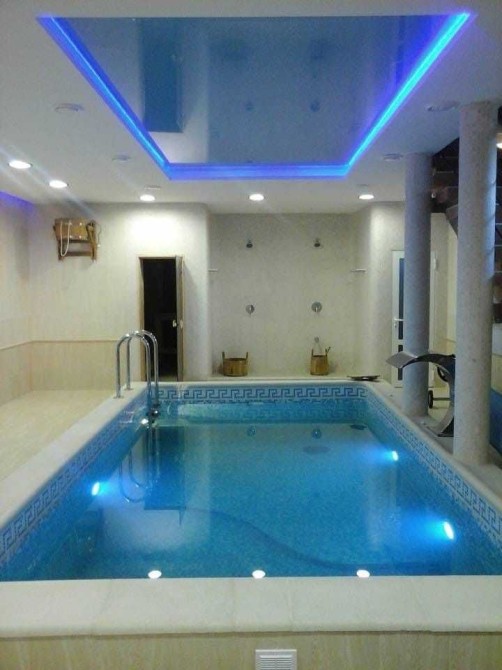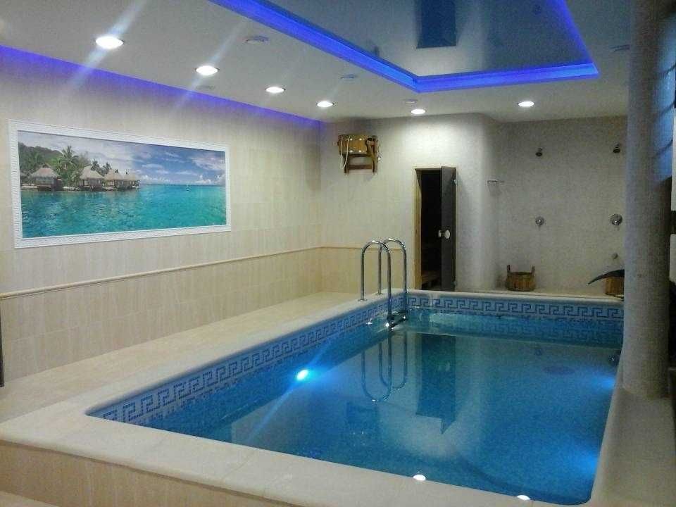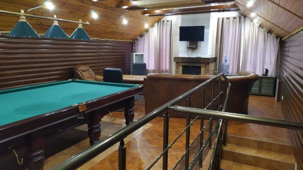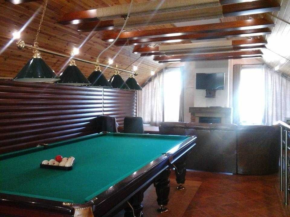 Простора сауна з парілкою, глібоким басейном, душом санвузлом, та великою кімнатою для відпочинку з більярдом та каміном.