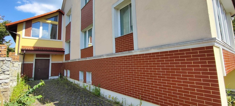 Будинок побудований з цегли, панельне перекриття, утеплений мінватою, дах з керамічної черепиці, має 2 поверхи цоколь та мансарду . Двір оздоблений бруківкою, огорожа зроблена з каменю.