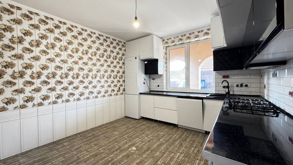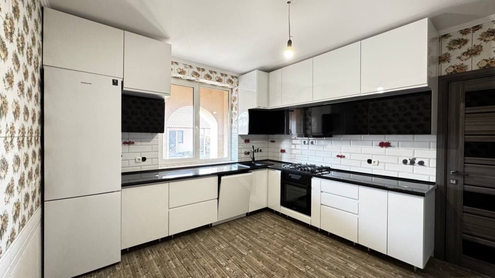 На першому поверсі є кухня вже з меблями та технікою.Вся кухня ,в тому числі стіни,обкладені плиткою ,меблі -фарбовані фасади ,духовка,посудомийка,холодильник вже ще на гарантії.