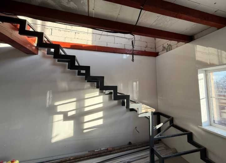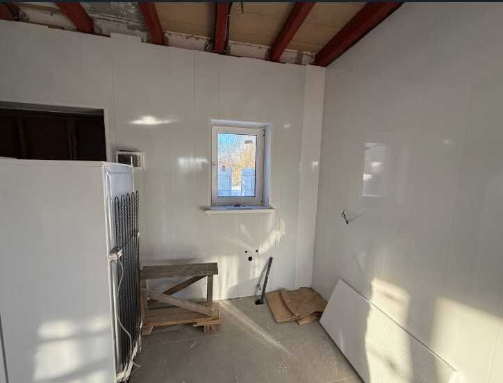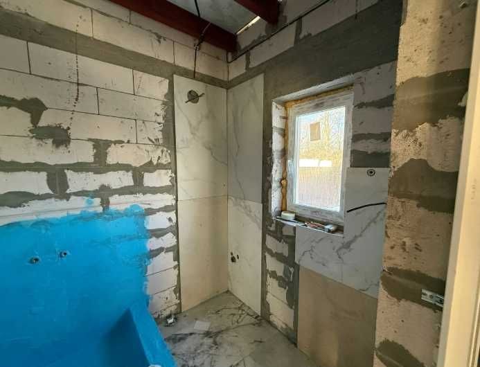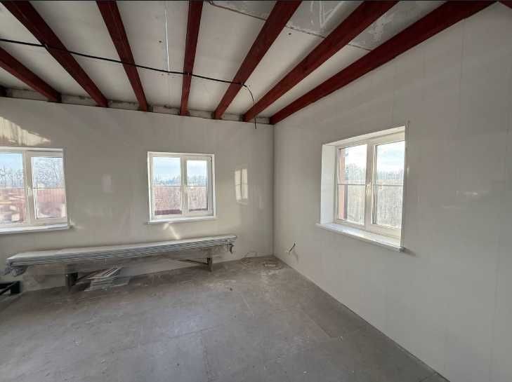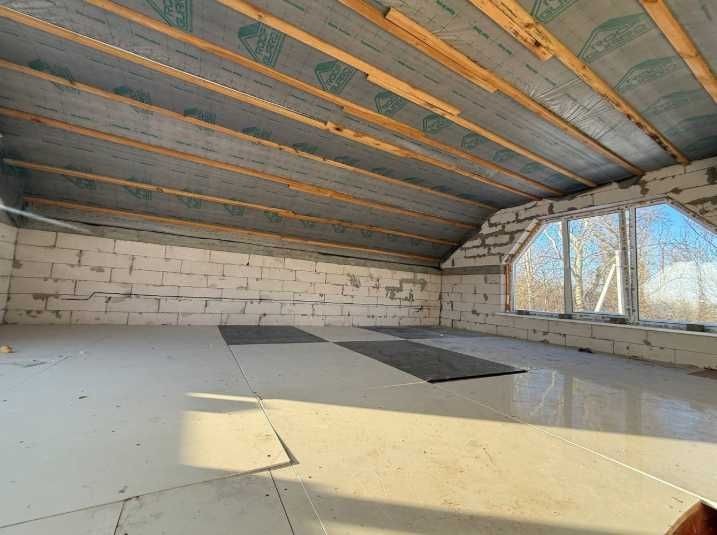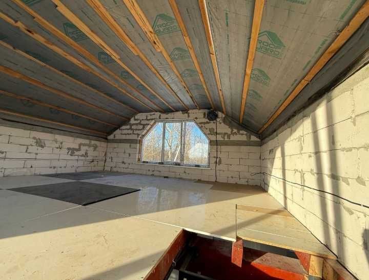 На першому поверсі – кухня-вітальня та санвузол з душем, на другому – вільне планування за проектом 2 кімнати та санвузлом. Ділянка – 2 сотки. Матеріали: газоблок, пінопласт (100 мм), мінеральна вата (150 мм). Електрика – 14 кВт, 3 фази; вода – з власної свердловини; каналізація – септик на 7 кубів.