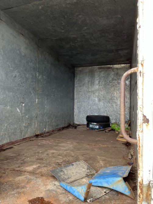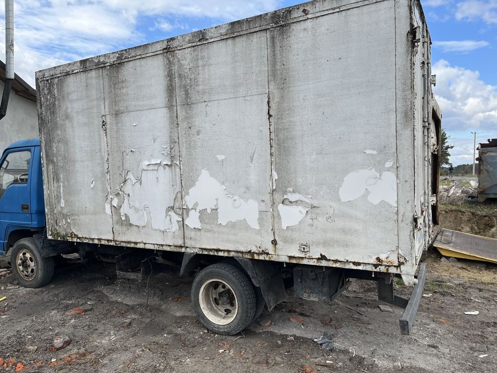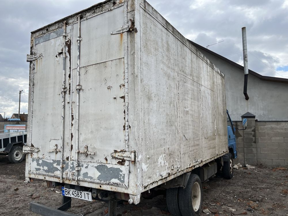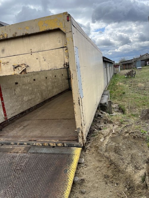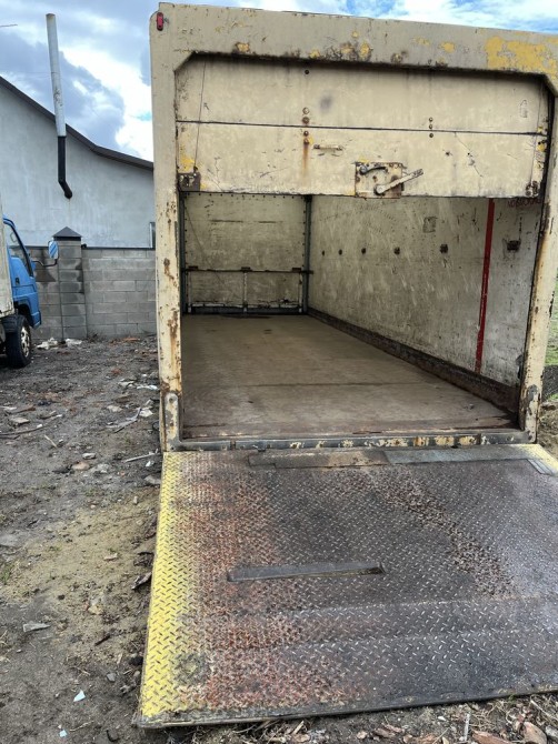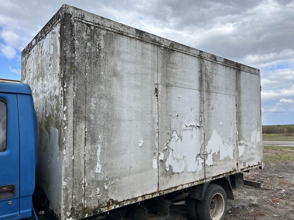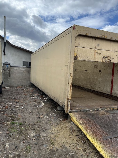 Старий, пошкоджений фургон для перевезення вантажів. Кузов має сліди зносу та пошкоджень, що свідчить про його тривале використання. Незважаючи на зовнішній вигляд, фургон може бути придатним для ремонту та подальшого використання.